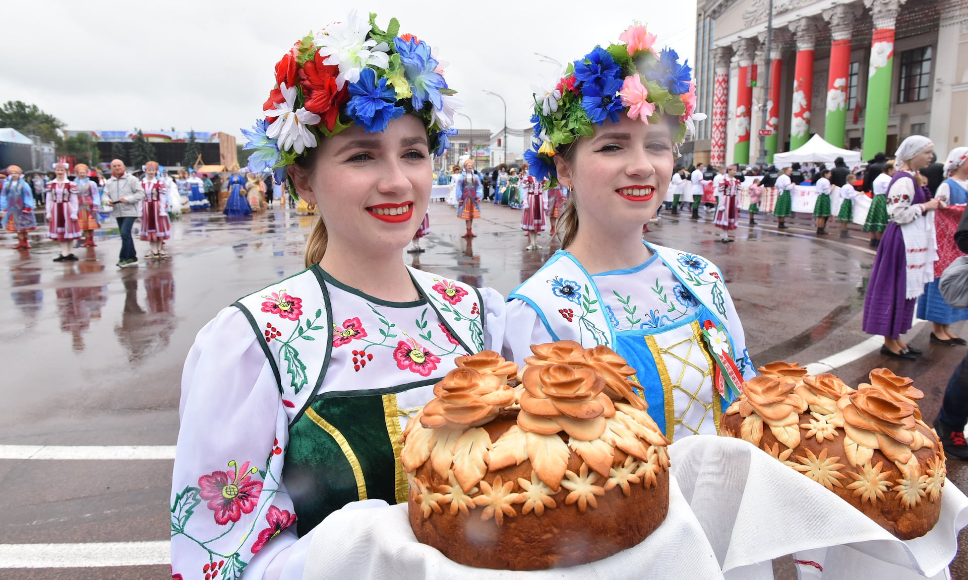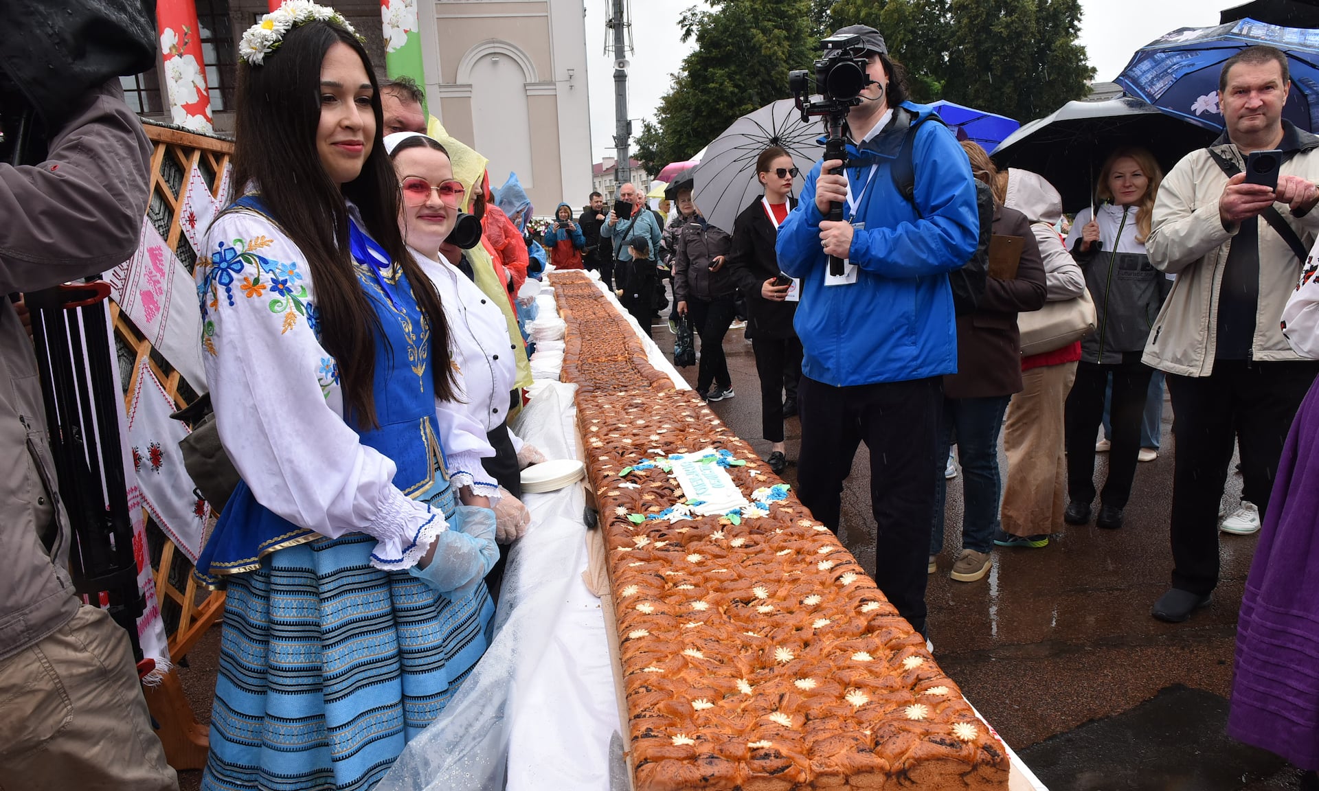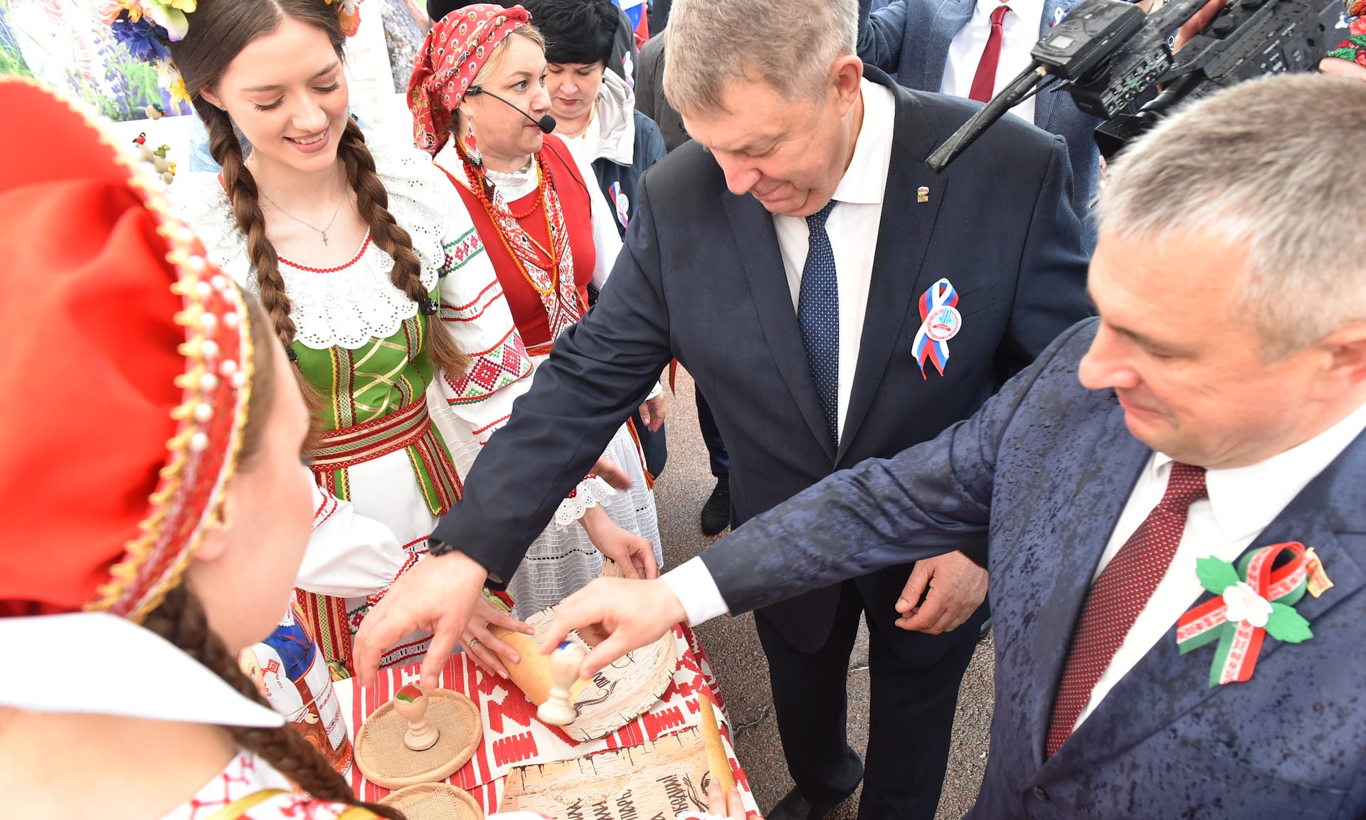 Город мастеров встретил почетных гостей традиционным караваем и 80-метровым славянским пирогом — его испекли брянские и гомельские хлебопеки как символ юбилея Великой Победы, единства и дружбы славянских народов.