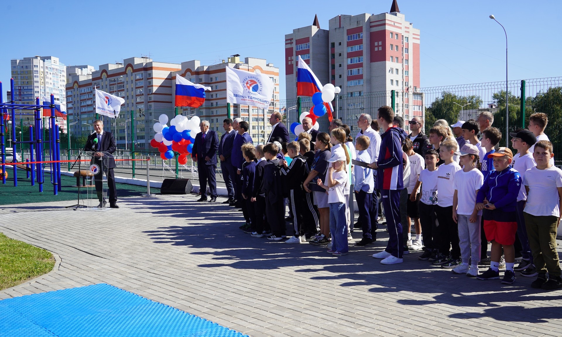Площадка открыта в лучшем спортивном сооружении России 2023 года, Дворце единоборств имени нашего прославленного спортсмена Артема Ивановича Осипенко, который является гордостью Брянской области, нашим «русским медведем», капитаном сборной страны по самбо.
