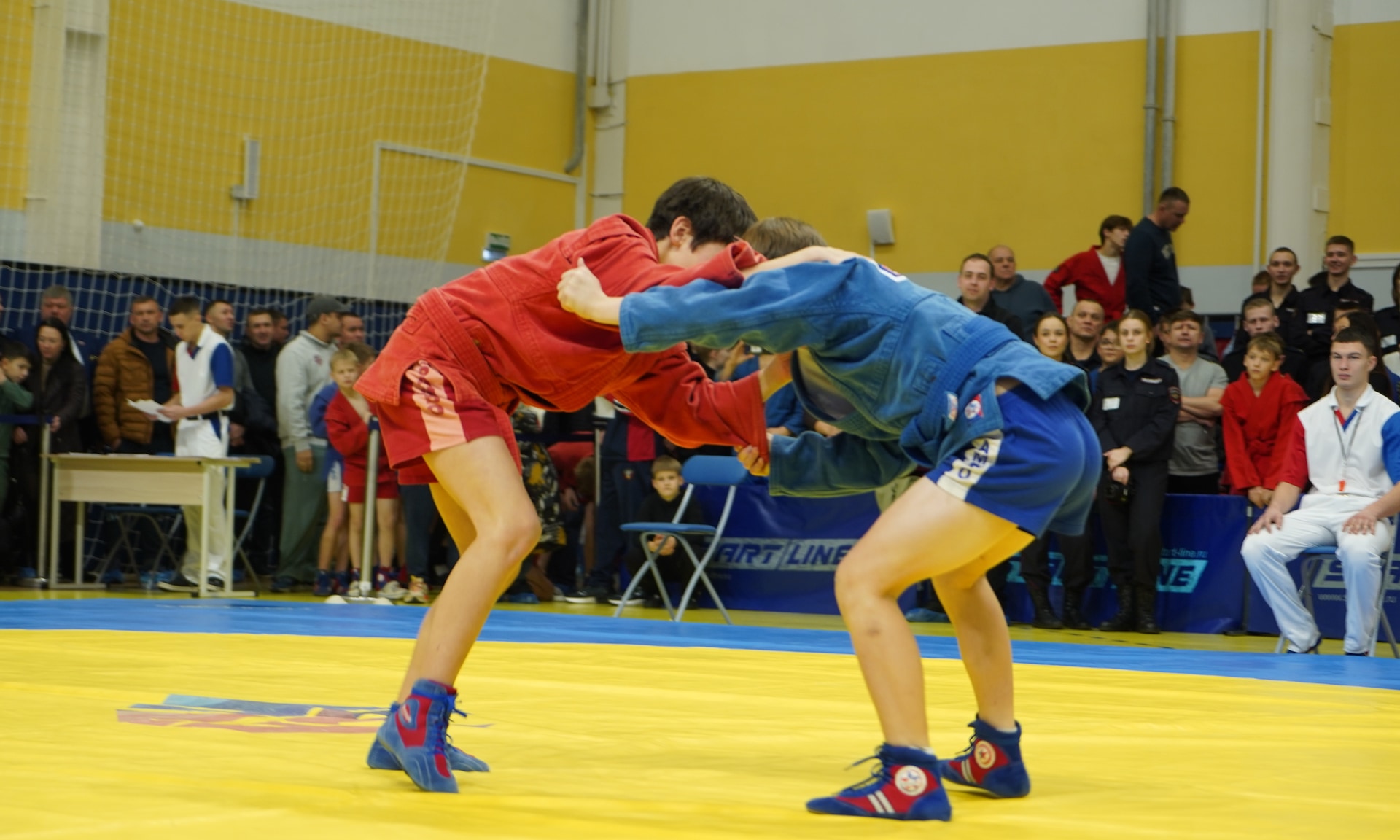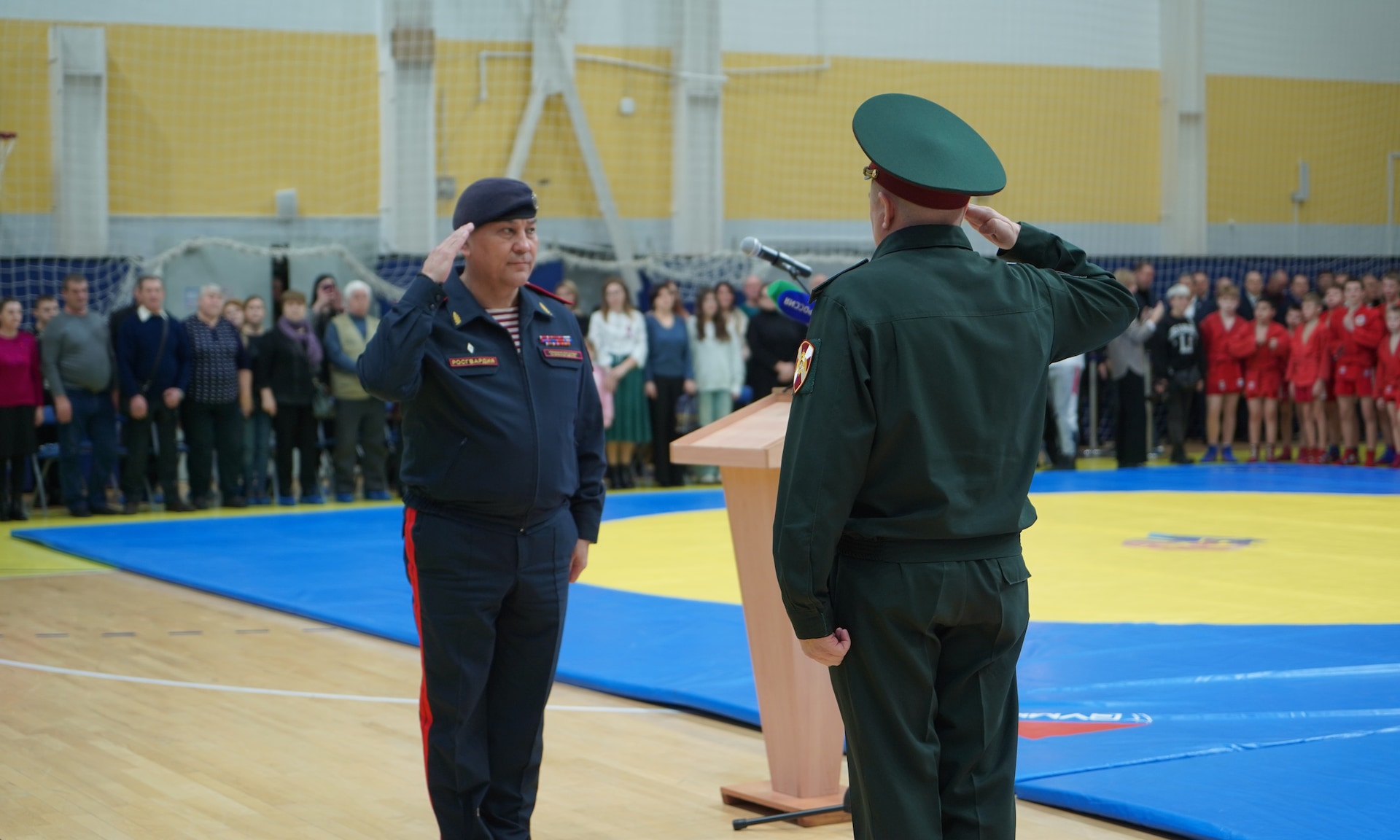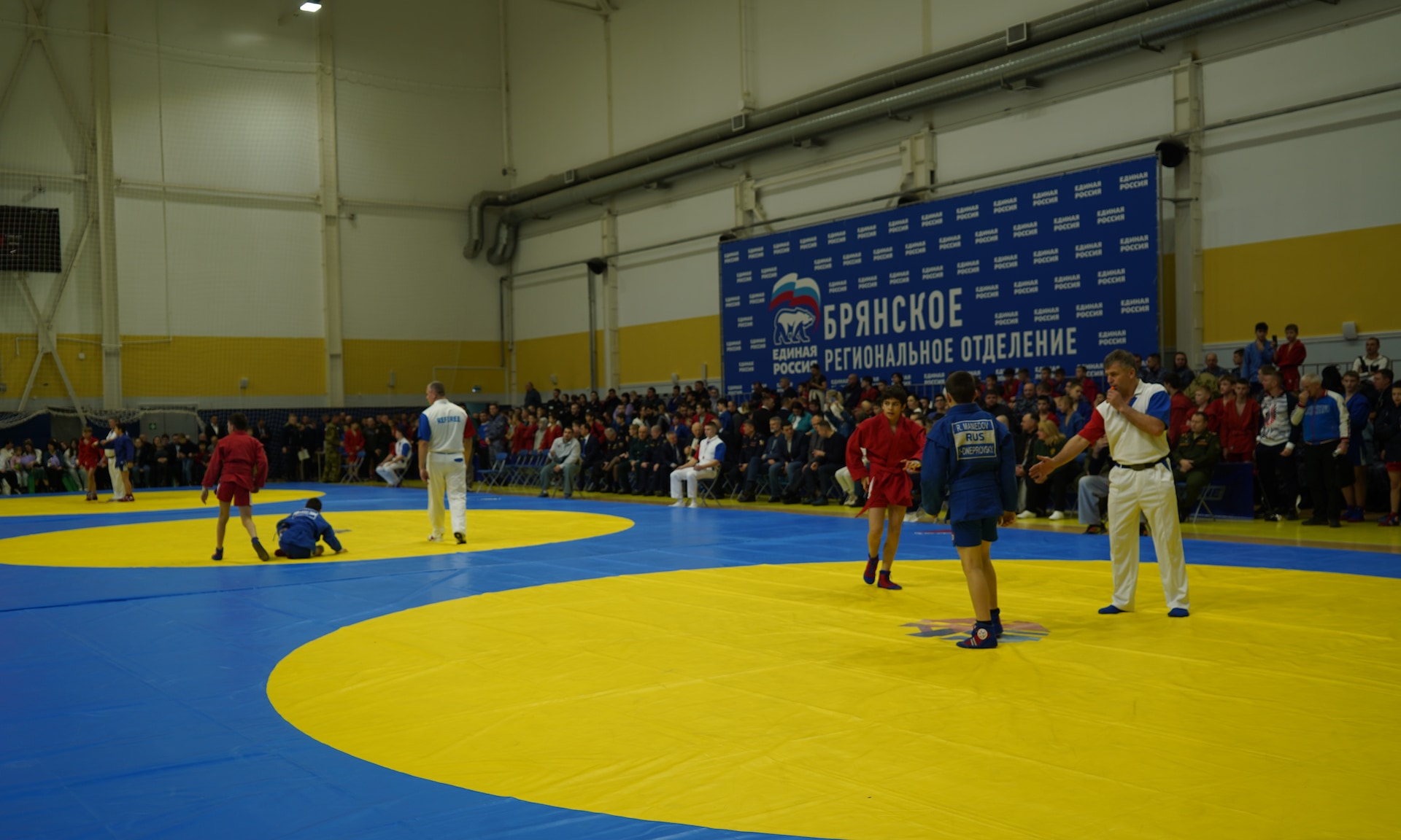 Соревнования проходят в одном из лучших спортивных сооружений нашей страны, во Дворце единоборств имени Артема Ивановича Осипенко. Это еще раз говорит о том, что для того, чтобы воспитать настоящих защитников, нам нужно, чтобы наши дети занимались спортом. И один из таких видов спорта — это, конечно же, самбо, наш национальный вид спорта, самооборона без оружия.